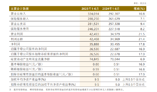 8月27日金融一线消息,中国人保发布2025年中期业绩。数据显示,上半年,中国人保实现净利润358.88亿元,同比增长17.8% ;归属于母公司股东净利润265.30亿元,同比增长16.9%。实现保险服务收入2802.50亿元,同比增长7.1% ;原保险保费收入24546.25亿元,同比增长6.4%。截至2025年6月30日,集团投资资产规模突破1.7万亿元,较年初增长7.2%;总资产18784.95亿元,较上年末增长6.3% ;综合偿付能力充足率为276% ,核心偿付能力充足率为219%。