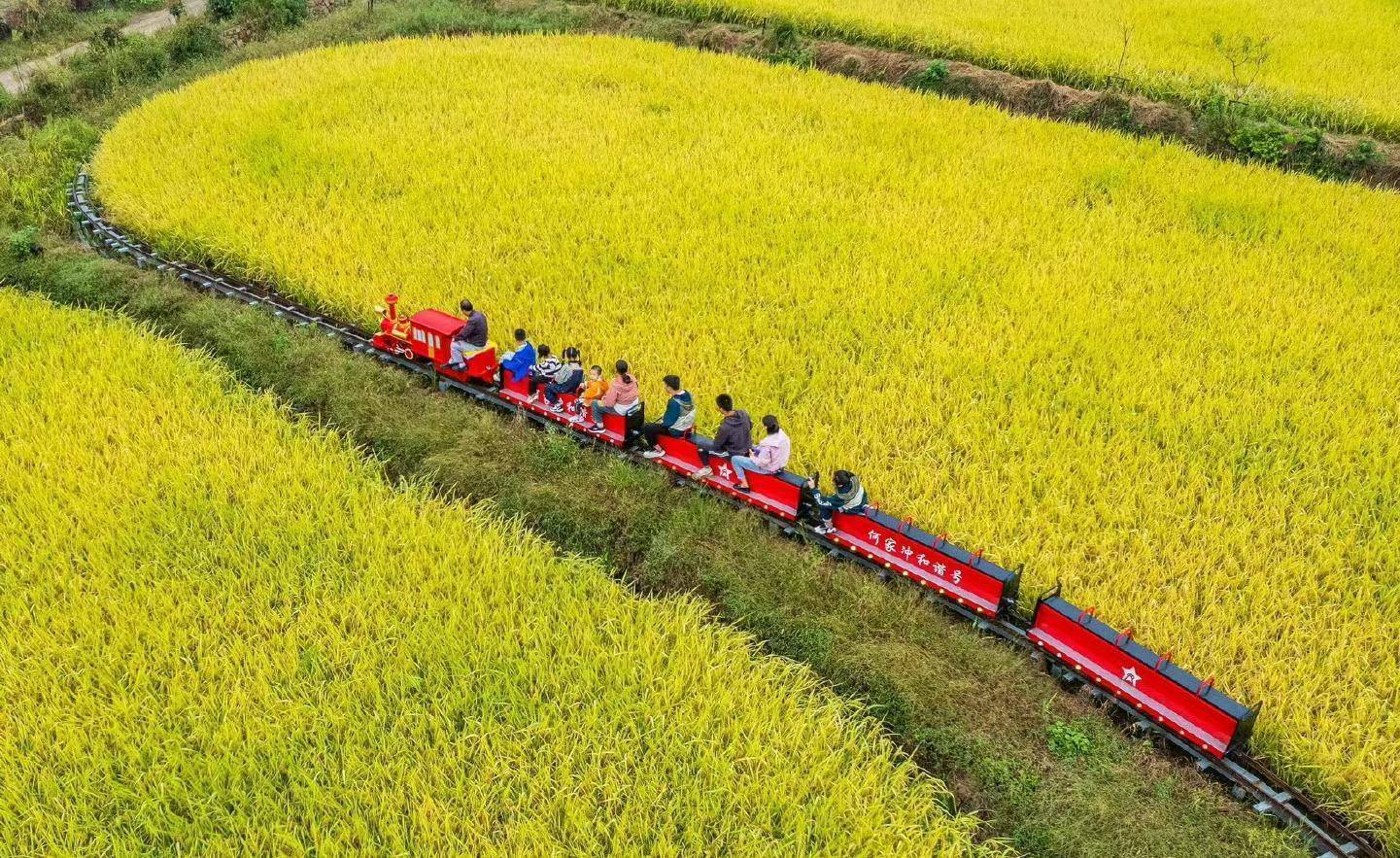 何家冲村内,游客体验乘坐观光小火车。(受访者供图)